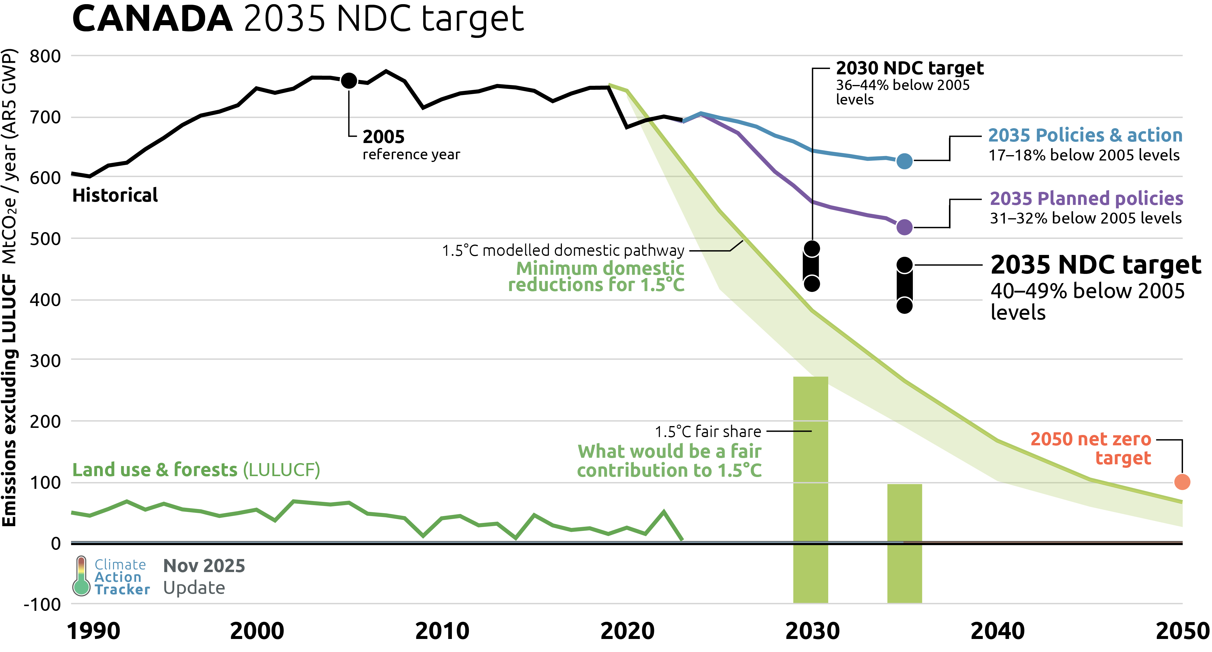 Canada submitted its 2035 Nationally Determined Contribution (NDC) mitigation target on 12 February 2025, setting a 2035 target of a 45–50% reduction in GHG emissions below 2005 levels. While this target is communicated as covering all sectors and all gases, the land use, land use change and forestry (LULUCF) sector plays a special role: Canada excludes LULUCF from the baseline, but partially counts its contribution to emissions reductions and removals towards meeting the 2035 target. For consistency and comparability across different countries, the CAT excludes emissions from LULUCF from this target, resulting in an emissions level of 388–455 MtCO2e in 2035 – or a reduction of 40–49% below 2005 levels.