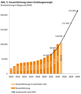 The government is aiming for a cumulative installed renewable electricity capacity of 360 GW by 2030, including 215 GW solar PV 115 GW onshore wind and 30 GW offshore wind (Federal Ministry of Economics and Climate Protection, 2022), more than twice the 169 GW installed as of early 2025 (Fraunhofer ISE, 2025a). In support of this, the EEG 2023 raised annual expansion targets and tender volumes, while the Photovoltaics Strategy 2023 outlines further enabling measures to speed up deployment (BMWK, 2023e).