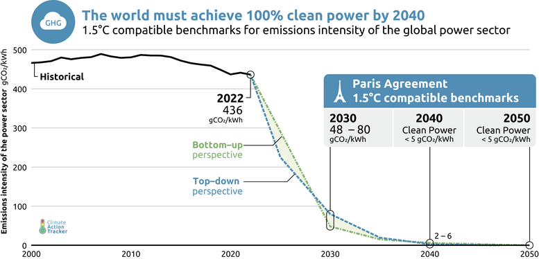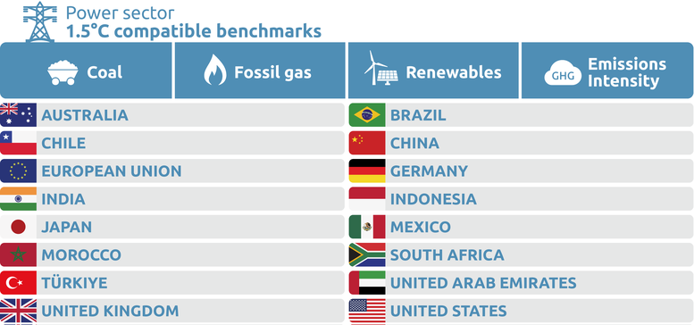 In this report, the Climate Action Tracker (CAT) provides new 1.5°C compatible benchmarks for the power sector, for the world as a whole and 16 countries, a mix of developed and developing. These are: Australia, Brazil, Chile, China, EU27, Germany, India, Indonesia, Japan, Mexico, Morocco, Türkiye, South Africa, the UAE, the UK, and the US.