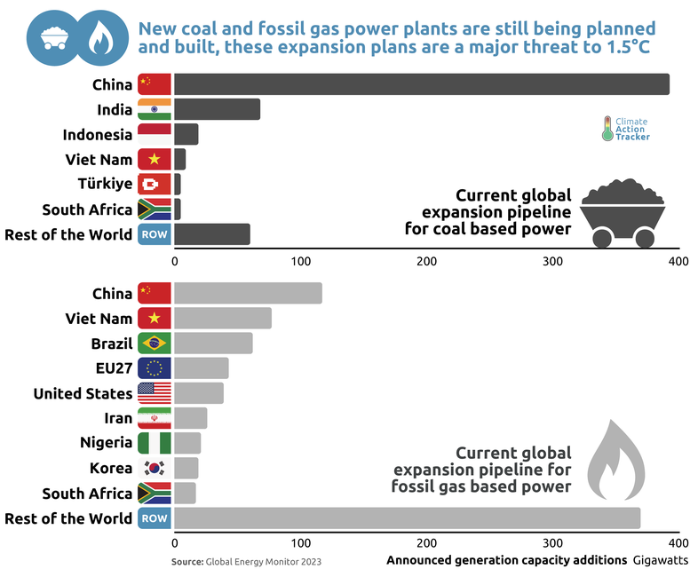 Worryingly, countries are continuing to build new coal and gas-fired power plants, representing a critical threat to the Paris Agreement. There is currently 558 GW of coal either planned or under construction across the world. The pipeline is even bigger for fossil gas with around 790 GW of fossil gas-fired plants either under construction or proposed. Unlike coal where it is centered almost entirely in China, India and Indonesia, the dash for gas is global, with almost all countries planning on building new fossil gas plants.