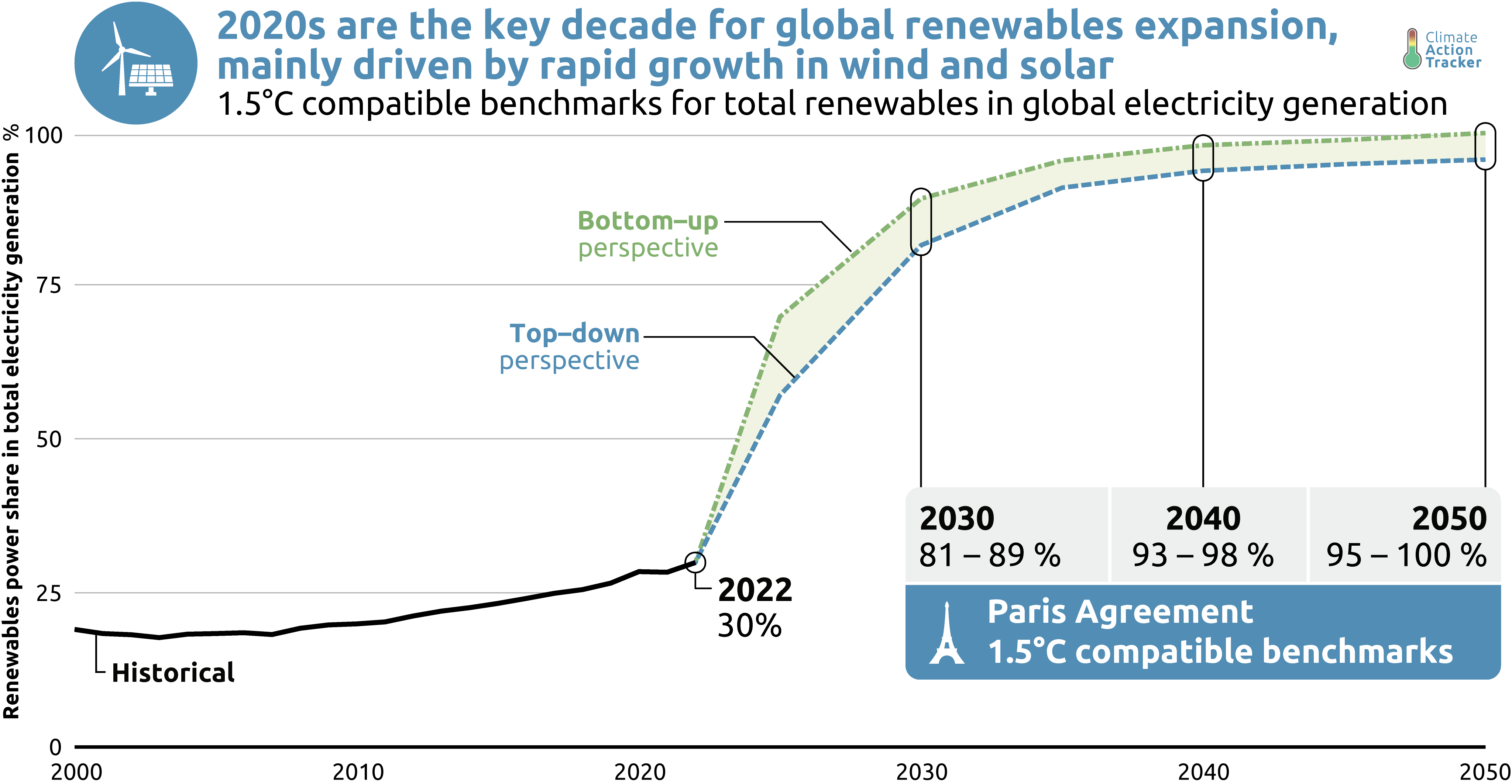 A 1.5°C aligned power sector transition will be driven by renewables, particularly wind and solar. By 2030, the global share of renewables reaches 81–89% in 1.5°C-compatible pathways, growing to 93–98% by 2040 and 95–100% by 2050.
