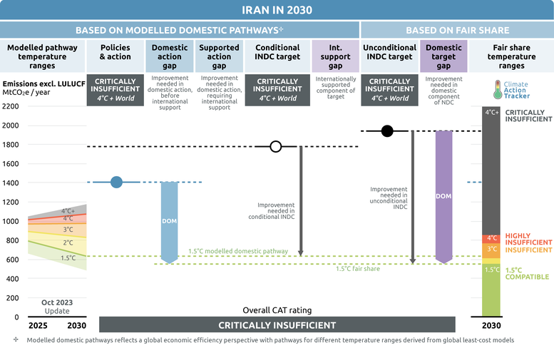 The “Critically insufficient” rating signals minimal to no action and is not at all consistent with the 1.5°C temperature limit. If all countries were to follow Iran’s approach, warming would exceed 4°C.