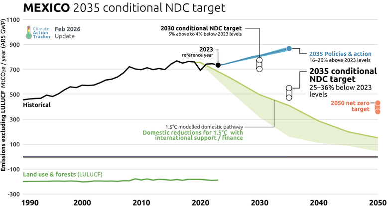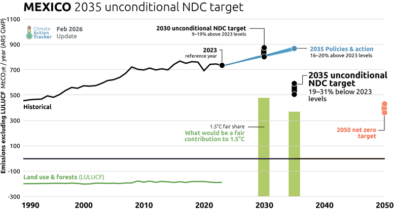 The Mexican government has committed to an absolute unconditional net emissions range of 364-404 MtCO2e (equivalent to a 31-19% reduction below 2023 levels excluding LULUCF) and a conditional target of 332-363 MtCO2e by 2035 (equivalent to a 36-25% reduction below 2023 levels excluding LULUCF) contingent on international finance. Neither of these targets aligns with limiting warming to 1.5°C.
