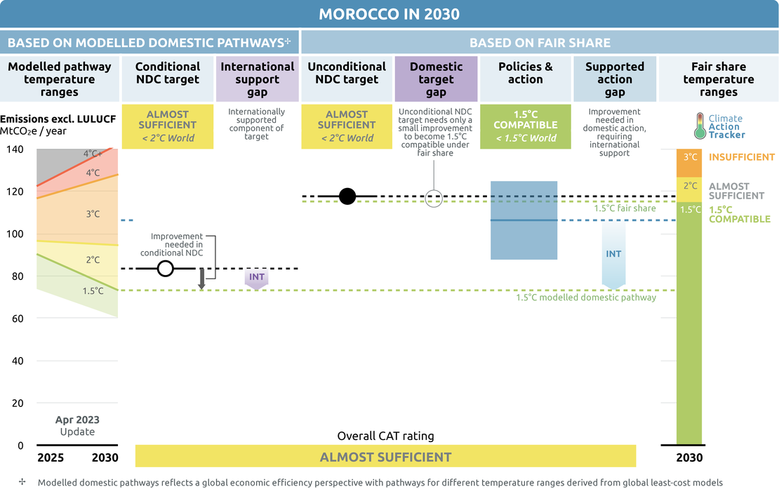 We rate Morocco’s policies and actions as “1.5°C compatible” compared to its fair share contribution. The “1.5°C compatible” rating indicates that Morocco’s climate policies and action are consistent with limiting warming to 1.5°C. Morocco’s climate policies and action do not require other countries to make comparably deeper reductions. When compared to modelled domestic pathways, the policies and action are not yet sufficient for getting on a decarbonisation pathway. Morocco should embark on such a pathway—with international support.