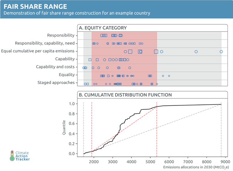 We construct a “fair share range” for each country from the range of fairness estimates from the literature. We further use a weighting scheme to make sure that all equity viewpoints (categories) are considered equally. The fair share boundaries are chosen as the inner 90% of the study distribution. By doing so, we limit the influence of extreme studies while having the wide majority of studies included in the fair share range. We then divide the “fair share range” into sections, or ratings, by taking the same level within that range for all countries. This allows to define the same level of ambition for all countries with regards to their individual fair share literature and determine fair emission allowances in the years 2025, 2030 and 2050.
