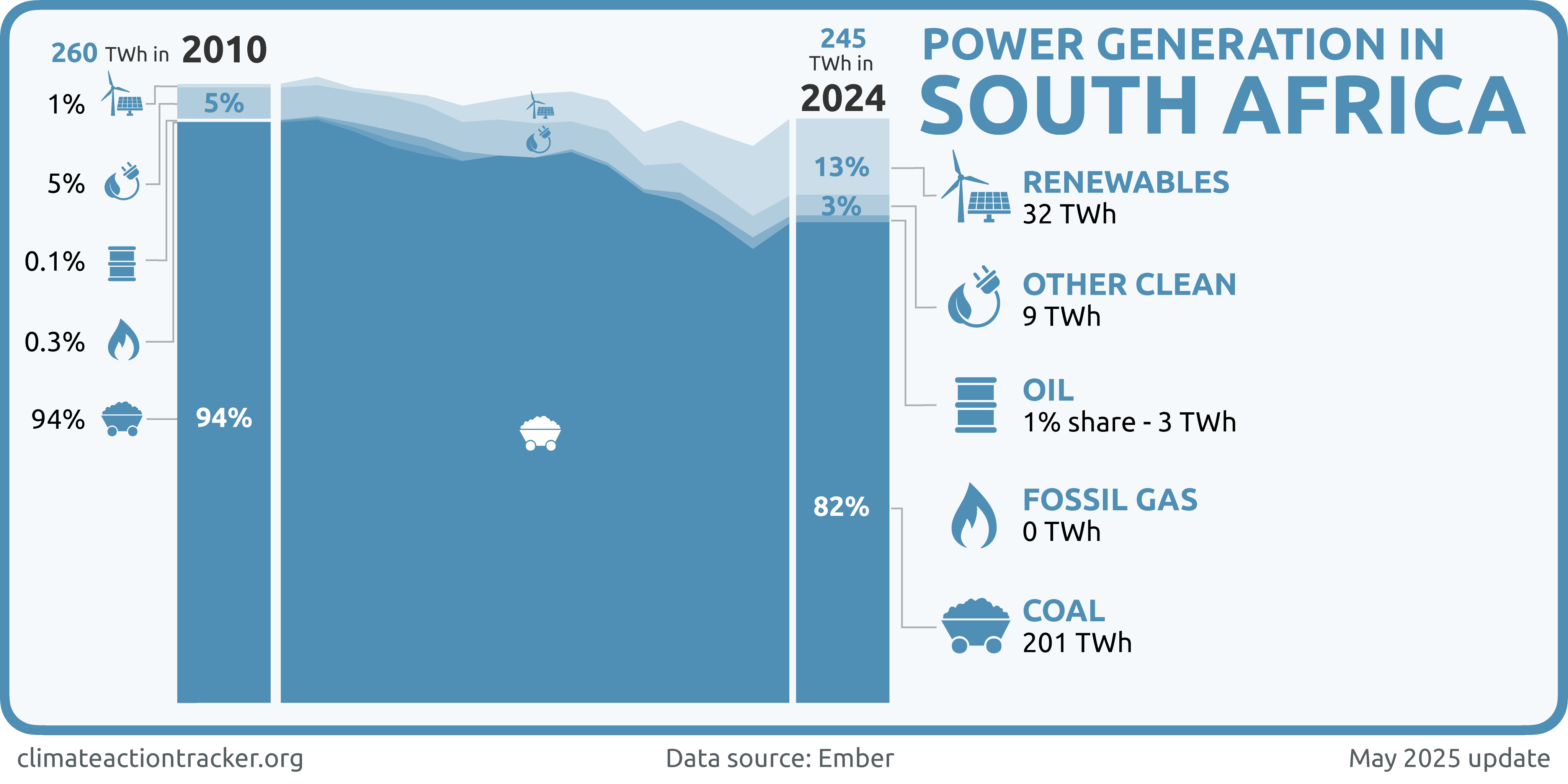 South Africa’s coal-dominated power sector is a major contributor to the nation’s emissions, accounting for over 40% of total GHG emissions in 2022 (South African Government, 2024b). Coal accounted for 82% of the country’s power mix, followed by renewables (13%), nuclear (3%), and oil (1%) (Ember, 2025).