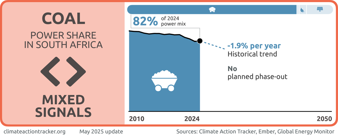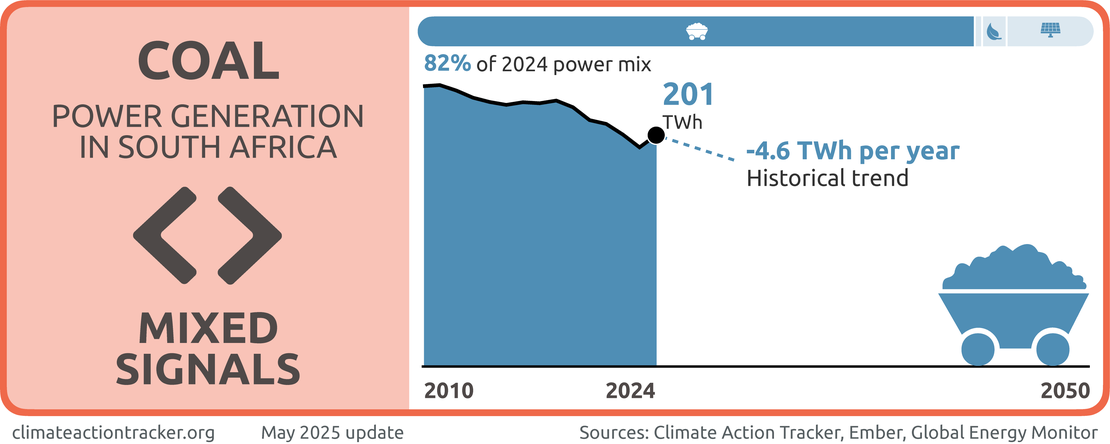 South Africa government is sending “Mixed signals” on coal. While the overall share of coal in the power sector has slowly declined in the last five years, the plant decommissioning roadmap appears to have been delayed, and new coal capacity was recently added to the grid.