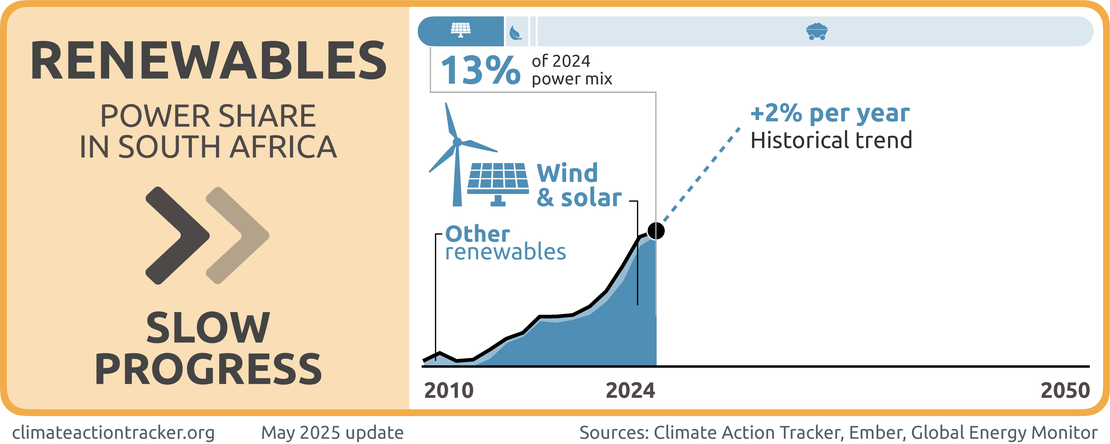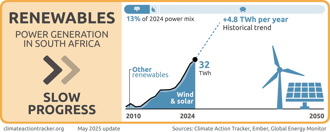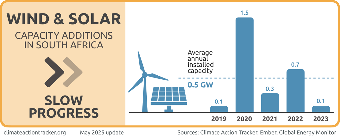 South Africa is making “Slow Progress” on deploying renewables. Despite commendable progress in recent years in challenging circumstances, the country’s grid remains dominated by fossil fuels. The approved 2019 Integrated Resource Plan targeted 27.6 GW of renewables to be installed by 2030, excluding large hydro. At just under 10 GW of installed renewable capacity as of 2023, South Africa’s renewable expansion plans are off-track (Cunliffe, 2023). Furthermore, the draft 2023 IRP lowered the expected installed capacity of wind and solar by 2030. Nonetheless, wind and solar capacity and generation has been ramping up in South Africa in recent years, rising from 4.5% of total generation in 2019 to 11.6% in 2023 (Ember, 2025). South Africa will need international support to ensure that current ambition levels are retained and increased further to maximise the country’s potential for renewable electricity generation.