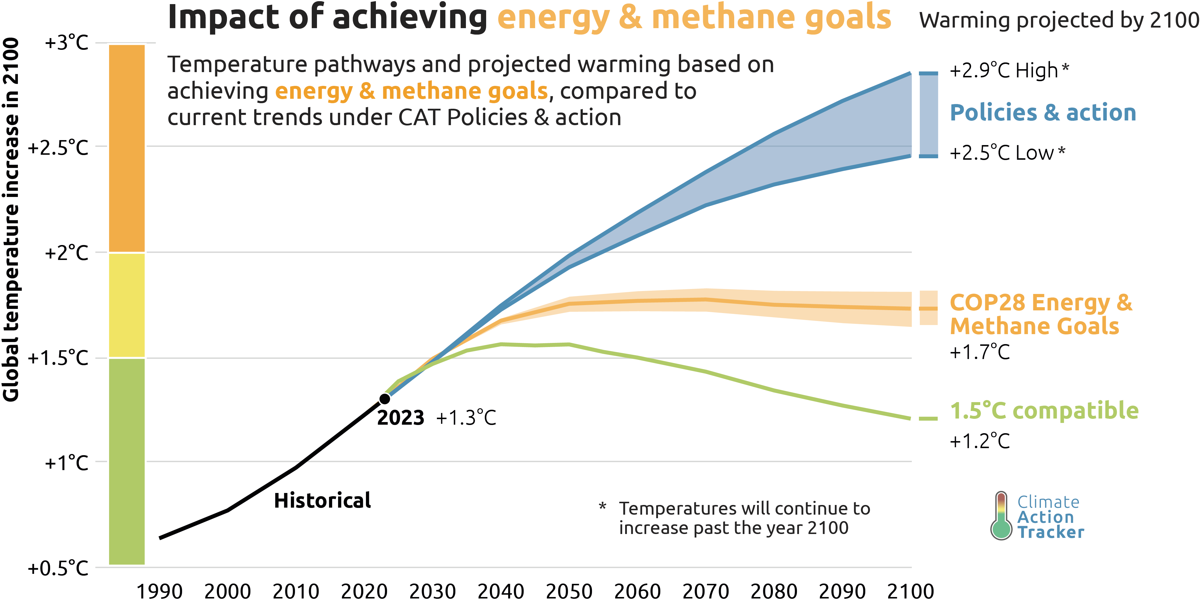 If they continued this action, government would put the world on track to lower projected 21st century warming by about 0.9˚C, from 2.6˚C to 1.7˚C. This could be almost as much as the entire 1˚C improvement seen over the ten years since governments adopted the Paris Agreement and would be a massive step towards keeping the 1.5˚C limit in sight.