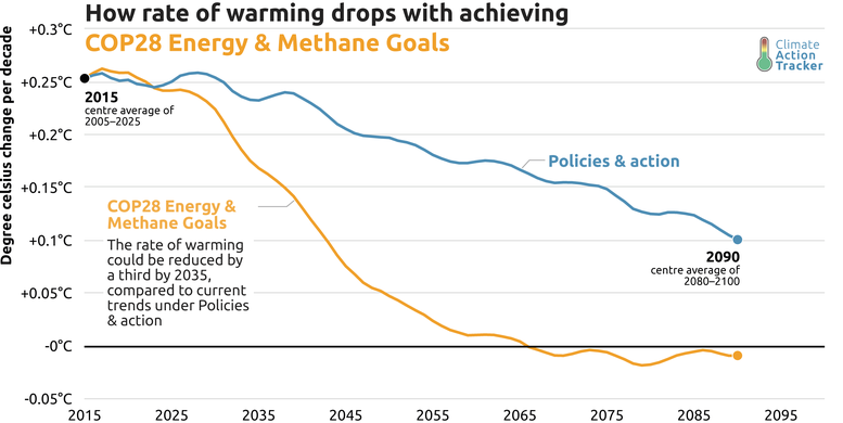 - Tripling renewables, doubling energy efficiency and cutting methane by 2030 and beyond would cut warming rate by a third in ten years, and halve it by 2040.